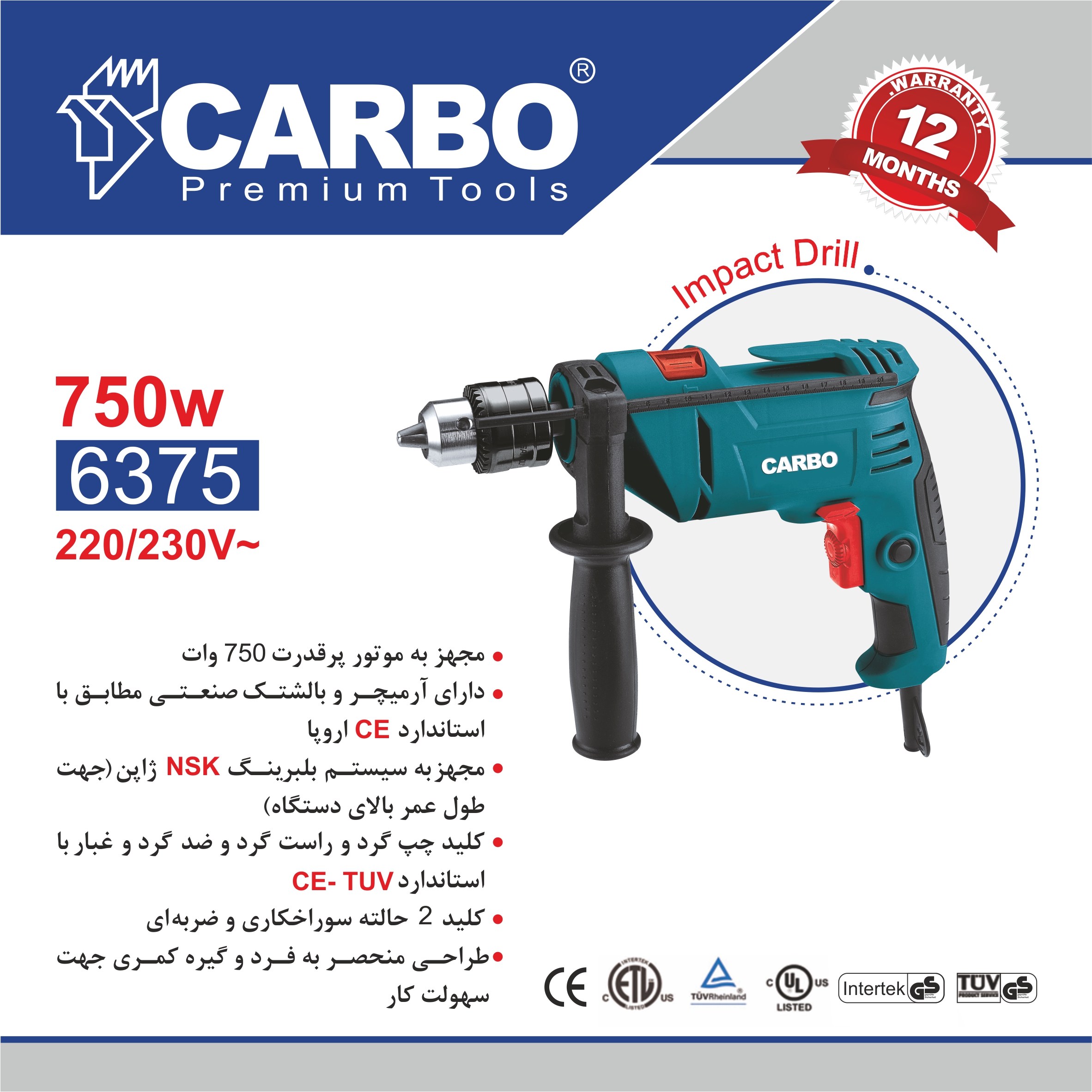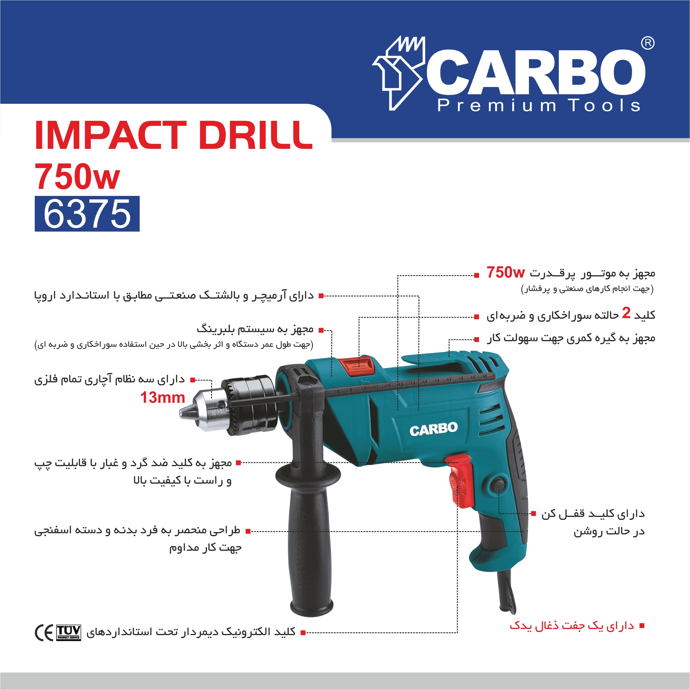 مجهز به موتور پر قدرت 750 وات جهت استفاده در کارهای صنعتی و پر فشار -دارای ارمیچر و بالشتک صنعتی مطابق با استاندارد اروپا- مجهز به سیستم بلبرینگ(جهت طول عمر دستگاه و اثر بخشی بالا در حین استفاده سوراخکاری و ضربه ای)-مجهز به گیره کمری (جهت سهولت کار)-طراحی منحصر به فرد بدنه و دسته جهت کار مداوم-کلید الکترونیک دیمردار تحت استانداردهای CE- مجهز به کلیلید گردو غبار با قابلیت چپ و راست با کیفیت بالا-کلید 2 حالته سوراخکاری و ضربه ای- دارای یک جفت ذغال یدک