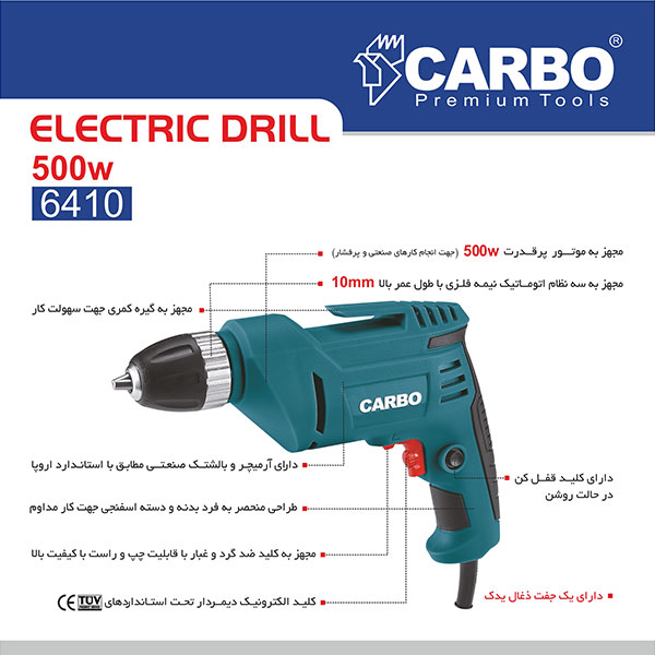 مجهز به موتور پر قدرت 500 وات جهت انجام کارهای صنعتی و پر فشار -دارای ارمیچر و بالشتک صنعتی مطابق با استاندارد اروپا- کلید الکتروتیک دیمر دار تحت استانداردهای CE - مجهز به کیلید ضد گرد و غبار با قابلیت چپ و راست با کیفیت بالا -طراحی منحصر به فرد بدنه و دسته اسفنجی جهت کار مداوم -مجهز به گیره کمری جهت سهولت کار-دارای یک جفت ذغال یدک